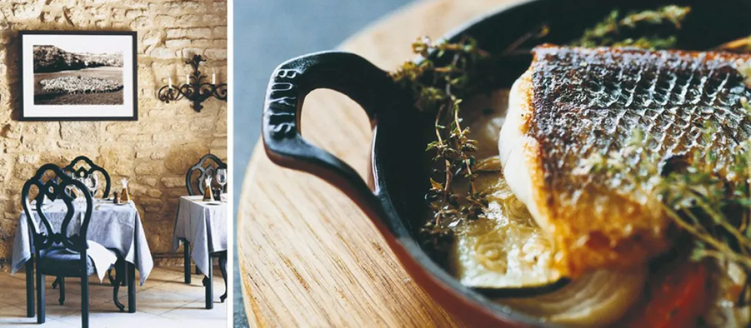 Le Restaurant, o restaurante do hotel, serve o seu jantar num edifício do século XVI que já foi a escola da vila e, no Verão, é possível jantar ao ar livre no terraço com vista para os vinhedos.