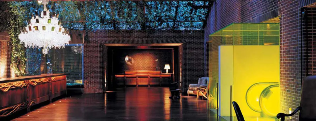 O Hudson é um hotel contemporâneo em que a decoração foi concebida porPhilippe Starck. Por detrás de uma fachada austera esconde-se um lugar moderno onde as pessoas vão ver e ser vistas. Tem dois bares: o Library, intimista; e o Bar Hudson, com o seu piso iluminado, tectos pintados e cadeiras transparentes. No Verão não pode perder o soberbo terraço no 15.º andar.é um hotel in que se juntou a uma série de hotéis com conceito de design acessível. No princípio era um motel chique; hoje ocupa o edifício da YWCA (Associação Cristã Feminina) de 1928. Situado na rua 58, atravessando o Central Park, fica perto da Broadway, e é fruto da aliança do famoso empresário e criador do conceito de hotel boutique Ian Schrager e do renomado designer Philippe Starck. Aqui encontramos um toque da fantasia kitsch dos anos 60; para subir temos um elevador em cristal de chartreuse, e o bar tem o chão iluminado, cadeiras de Dali e de Luis XVI estofadas em cor prata tipo Barbarella. O parque parece que "engoliu" o mesmo que Alice, no País das Maravilhas, com os seus regadores de 2000 litros, os seus vasos de um metro de altura e as chaises longues nos caminhos que cortam o jardim. Mas a maior parte do hotel está mobilado ao estilo das universidades norte-americanas. O lobby central de tijolos e hera, com um enorme candelabro de cristal, pretende ser uma reminiscência de Harvard Square. Depois, as cadeiras de clube na cor púrpura e as lareiras da biblioteca são mais ao estilo Oxford 1930 do que os quartos, com móveis de madeira sintética, mais recentes. E, no lugar de abajurs junto à cama vemos caixas de luz pintadas por Francesco Clemente.No Hudson Hall, com os seus grandes vaporizadores e mesas amplas, servem-se pratos mais suculentos do que a comida tradicional servida no campus (como por exemplo, sopa de lagosta). Os quartos tipo standard do andar superior são pequenos e com tectos rebaixados: afinal, o prédio era da YWCA. Aqui encontramos o autêntico estilo Starck: camas quadradas, mesas de aço inoxidável, chão em madeiras nobres e muito branco por toda a parte. Os móveis, contudo, são mais antiquados do que o estilo Starck; pretendem evocar as cabinas de barco vitorianas que economizam espaço sem perder a elegância (os obscuros corredores também são reminiscências de um navio). Abertas as cortinas, têm-se uma excelente visão mesmo deitado na cama. Também se pode optar por uma mudança radical e reservar uma suite tipo escritório ou ginásio- uma grande escolha se o que se necessita é trabalhar a mente ou o corpo.356 W 58th Street